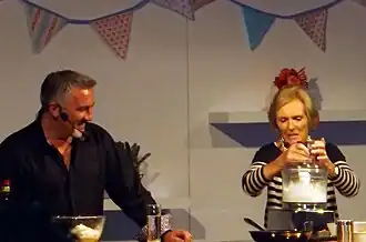 From 2010 to 2016, Berry was one of the judges on BBC One's (formerly, BBC Two's) The Great British Bake Off alongside baker Paul Hollywood, who specialises in bread. Berry says that since working together, she has learned from him. However, some viewers were outraged during the first series when a decision was made to make the contestants use one of Hollywood's recipes for scones instead of one of Berry's.[1]