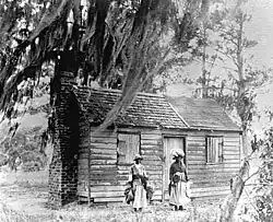 Mary Jane McLeod was born on July 10, 1875 in a small log cabin near Mayesville, South Carolina, on a rice and cotton farm in Sumter County.[5] She was the fifteenth of seventeen children born to Sam and Patsy (née McIntosh) McLeod, both former slaves.[6][7][8] Patsy McLeod worked after emancipation for her former owner, earning enough to buy five acres from him.[a] There, Sam and their sons built the log cabin in which McLeod was born.[10] McLeod grew up hearing stories from her maternal grandmother, Sophie, about resistance to slavery, and both Sophie and Patsy told McLeod that she was special. McLeod credited them both with inspiring her work toward equality.[11]
