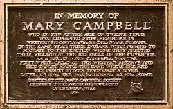 Who in 1759 at the age of twelve years was kidnapped from her home in Western Pennsylvania by Delaware Indians. In the same year these Indians were forced to migrate to this section where they erected their village at the big falls of the Cuyahoga. As a result Mary Campbell was the first white child on the Western Reserve and this tablet marks the cave where she and the Indian women temporarily lived. Later, in 1764, she was returned to her home.