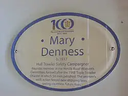 Karl Turner MP described her as a "Hull legend". Former Deputy Prime Minister John Prescott said "they do not build them like Mrs Mary Denness anymore. She was a wonderful woman and along with Mrs Bilocca, Mrs Blenkinsop and Mrs Smallbone [Jensen] she changed the most dangerous of industries. All fishermen, indeed all who go to sea, should be grateful for the massive changes they brought that saved thousands of lives to come".[1] Dr Brian Lavery, who wrote a history of the revolutionaries, described her as "a great campaigner but more than that, a great person whose eloquence, elegance, and kindness never failed to impress me".[10] A mural in honour of and depicting the women was unveiled in Hessle Road in October 2017, with the unveiling being attended by Denness' daughter Lorna.[11]