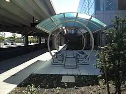 The Greenway passes through Bremen Street Park, where there is an entrance to the Blue Line Airport Station. Free shuttle buses connect the station to the airport terminals. A branch off of the Greenway leads to the East Boston Memorial Stadium and to the Logan Airport Rental Car Center, where there is also bicycle parking. Off of Bremen Street, the East Boston YMCA is located at the former engine house for the line, and was constructed in 1909.[3]