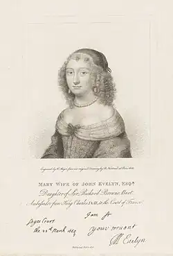 Mary Evelyn (née Browne; 1632–1709) was an English letter writer. She was the wife of the English diarist and intellectual John Evelyn. Described as a woman of "acute intelligence and tangible warmth", Mary earned praise throughout her life as a skilled artist, wife and mother, and homemaker.[1] She is known also for her letters to the Oxford don Ralph Bohun.[2]