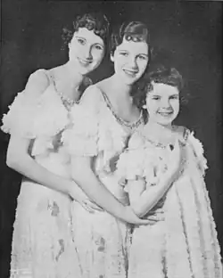 ![]() The Gumm Sisters, also known as the Garland Sisters, c. 1935: Top row: Mary Jane and Dorothy Virginia Gumm; bottom: Judy Garland | |