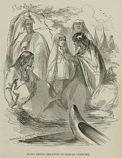 Mary later learned that it was a Seneca custom, when one of their own was killed or taken prisoner in battle, to take an enemy as prisoner or to take their scalp in a mourning ritual. Two Seneca women had lost a brother in the French and Indian War a year before Mary's capture, and in this mourning raid, the Shawnee intended to capture a prisoner or obtain an enemy's scalp to compensate them. The 12-year-old Mary and the young boy were spared, likely because they were of suitable age for adoption. Once the party reached Fort Duquesne, Mary was given to the two Seneca women, who took her downriver to their settlement. After a short ceremony, a Seneca family adopted Mary, renaming her as Deh-he-wä-nis (other romanization variants include: Dehgewanus, Dehgewanus and Degiwanus, Dickewamis). She learned this meant "a pretty girl, a handsome girl, or a pleasant, good thing."[1]