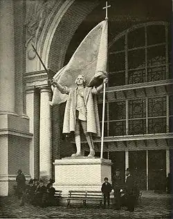 While in Chicago preparing for the World's Columbian Exposition, sculptor Augustus St. Gaudens recommended Lawrence, who had been his pupil at the Art Students League of New York for the previous five years, for the creation of the monumental statue of Christopher Columbus to be placed at the entrance of the Administration Building.[1] Like many of the buildings at the Exposition, the statue was made of staff, a temporary building material, and no longer exists.[2] Although some critics claimed that St. Gaudens, or his brother Louis, had in fact modelled the work, St. Gaudens himself debunked this by stating in his Reminiscences that Lawrence, "modeled and executed it and to her goes all the credit for the vitality and breadth of treatment which it revealed."[3]