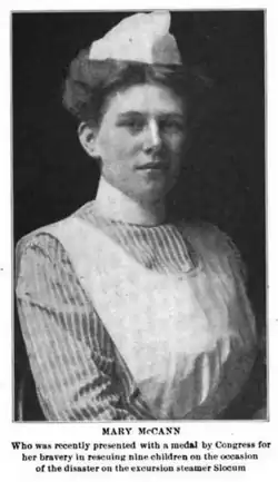 In June 1904, McCann was a teenager recovering from measles and scarlet fever,[3] when she witnessed the fire aboard the PS General Slocum from the hospital on North Brother Island. McCann, reportedly a strong swimmer,[1] waded into the East River and helped passengers to safety, including as many as nine children.[4] While hospitalized with the injuries she sustained that night, McCann also caught diphtheria.[3]
