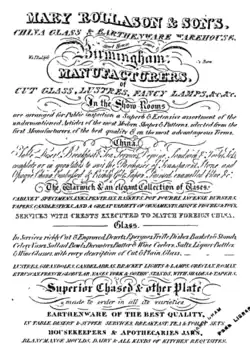 Rollason appears to have moved her business into pottery, where she was the dealer.[1] She sold her goods to the middle-classes from her business but she also operated as a wholesaler. She dealt in brass and cut-glass which was created at a manufactory she owned. The manufactory was nearby in Steelhouse Lane and in 1825 she brought her son into the business styling the company "Mary Rollason and Son".[1] They had a trade card for "Mary Rollason & Son's" advertising their china, glass and earthenware warehouse.[4] Their 1825 advert advised readers that they sold and made cut-glass, lustres and fancy lamps.[2]