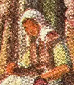 Mary was born about 1536 in Wilmcote, the daughter of Robert Arden, a gentleman farmer and junior descendant of the Arden family,[4][5] who were prominent in Warwickshire. She was the youngest of eight daughters, and when her father died in 1556 she inherited land at Snitterfield and Wilmcote from him as a dowry. The house was left to her stepmother Agnes Hill. Richard Shakespeare, the father of John Shakespeare, was a tenant farmer on land owned by her father in Snitterfield. As the daughter of Richard's landlord, she may have known John since childhood.[6] Mary married John Shakespeare in 1557, when she was 20 years old and her spouse was approximately 26 years old.[6] She bore eight children: Joan (1558), Margaret (1562–1563), William (1564–1616), Gilbert (1566–1612), Joan (1569–1646), Anne (1571–1579), Richard (1574–1613), and Edmund (1580–1607).[7] Though Mary gave birth to many children, several of them died young. Their first daughter, Joan, born 1558 died; the name being used again for their third daughter. Their second daughter, Margaret, also died in infancy.[6] Some members of the wider Arden family were of the Catholic faith.[6] John died in 1601 and Mary died in September 1608.[3]