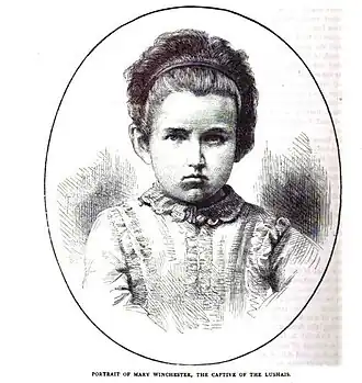 Mary Winchester lived with her father at Cachar, Assam, India. She was an illegitimate child of James Winchester and his Meitei worker.[6] Her father was a manager of the British tea plantation, and had been there for 12 years. When she turned six years of age in 1871, her father decided it was time for formal education in Britain. Her farewell party was arranged on 23 January at Alexandrapur plantation at the place owned by her father's close friend George Seller. While they were strolling in the garden, the workers were suddenly in commotion, and Seller was frantically galloping around on his horse. When Mary accompanied by a nurse headed towards the bungalow, her father met them on the way who ran her to a stable. But then the Mizo tribal warriors caught up, shot her father down from behind and cut his head.[7] The warriors snatched her away from the dying clutch of her father, who murmured, "Dear, only God knows your fate." They left him to die and carried the girl away.[8] A number of people were killed in the clash, some were taken as hostages, including Mary Winchester.[9] Probably all except the girl, of whom they took special care, died on their journey to Mizoram.[7][10]