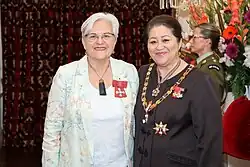 Street (left), after her investiture as a Member of the New Zealand Order of Merit by the governor-general, Dame Cindy Kiro, at Government House, Wellington, on 23 May 2024