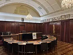 Internally this front section houses offices, meeting rooms, a large stair hall and entrance hall to the auditorium. The entrance hall provides access to the auditorium and other hallways through a series of double timber doors, some with arctic glazed panels and all surmounted by operable transom windows. A bifurcating concrete stair commences on the two sides of the entrance hall and meets at a landing above the entrance door, proceeding for another flight to the first floor level. At the first floor the stair hall has a painted pressed metal ceiling. Access is provided from the stair hall on this level to the Council Chamber and a large meeting room. As this area was subject to a damaging fire, much of the interior has been refitted, in the case of these rooms with a reconstruction of what was originally built. The Council Chamber has a barrel-vaulted plaster ceiling and is lined with timber wainscotting to about 2,500 millimetres (98 in).[1]