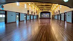 The auditorium wing is constructed of similar brickwork, but without stuccoed banding. Externally the section is lined with a series of simple pilasters, and has square arched openings centrally placed between the pillars. Surmounting the ridge of the corrugated iron clad roof of this section is a number of simple ventilators. The interior of the auditorium has a raked timber floor toward the stage which is framed by a classically inspired proscenium archway; flanked by reeded Corinthian columns supported a gently curved entablature. The heavily coffered timber ceiling of the auditorium is barrel-vaulted centrally. A gallery at the north eastern, entrance end, has a curved floor plan and features early seating. Flanking the auditorium are semi-open verandah spaces, to which access is provided from the hall through double French doors. Attached to the wall of the auditorium, toward the stage end of the room are five Honour Boards, commemorating the citizens of Maryborough's involvement in the various wars.[1]