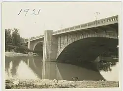 Street car service on the first Maryland Bridge was suspended in June 1920.[3] The bridge previously serviced street car routes 35 and 37.[4] Around the same time, concerns were raised of the safety of the bridge's infrastructure and a ban was put in place on heavy traffic and street cars crossing the bridge.[5] The original Maryland Bridge was decommissioned in 1921 after the completion of construction on the second bridge.[6][7]