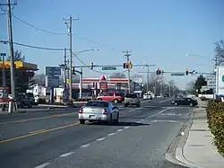 MD 12 crosses into Wicomico County, where it continues north through woods and farms with some residences.[1][2] The route turns northwest again before heading into a mix of residential areas and farm fields on the outskirts of the city of Salisbury.[2] The road comes to a partial cloverleaf interchange with US 13 (Salisbury Bypass), where the route briefly becomes a four-lane divided highway. Past US 13, MD 12 crosses into Salisbury at the Johnson Road intersection.[1][2] Here, the route heads north through commercial areas, becoming a six-lane road with a center left-turn lane, two southbound travel lanes and one northbound travel lane. In addition, there is one lane in each direction devoted to right turns. At the intersection with College Avenue/Beaglin Park Drive, the road narrows to four lanes with each direction consisting of one travel lane and a right-turn lane.[2] This configuration eventually ends and MD 12 becomes a two-lane road again, leaving the corporate limits of Salisbury. Upon entering Salisbury again, the route becomes municipally maintained and continues past a mix of residences and businesses with some industrial establishments. MD 12 crosses over a branch of the Wicomico River west of the Salisbury City Park, which contains the Salisbury Zoo, before ending at Main Street a short distance to the east of US 13 Bus. (Salisbury Boulevard) near downtown Salisbury.[1][2][6]
