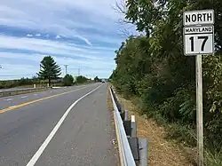 Maryland Route 17 (MD 17) is a state highway in the U.S. state of Maryland. The state highway begins at the Virginia state line at the Potomac River in Brunswick, where the highway continues south as Virginia State Route 287 (SR 287). MD 17 runs 29.49 miles (47.46 km) north from the Brunswick Bridge to the Frederick–Washington county line near Wolfsville. The state highway serves as the main north–south highway of the Middletown Valley of western Frederick County. MD 17 connects Brunswick and Wolfsville with Rosemont, Burkittsville, Middletown, and Myersville. The state highway also connects those communities with the valley's main east–west highways, which include U.S. Route 340 (US 340), US 40 Alternate, Interstate 70 (I-70), and US 40.