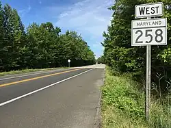 MD 258 was constructed as a gravel road from MD 2 to west of Lyons Creek in 1928.[3] The highway was extended to a point east of Cabin Branch in 1929 and 1930.[4][5] The remainder of MD 258 west to Bristol was started in 1930 and completed by 1933.[4][6] The western terminus was originally at MD 416, which became MD 4 in 1965; the intersecting roadway at the terminus is now part of MD 794.[7][8] MD 258 was paved in 1949.[9] The highway was extended west to its present terminus at Wrighton Road when MD 416 was expanded to a four-lane divided highway and its interchange with MD 258 was built in 1961.[10][11] The portion of MD 258 between MD 2 and MD 256 was built on a new alignment in 1963.[12][13] The roundabout at MD 258's terminus at MD 256 was installed in 2007.[14]