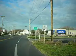 Maryland Route 346 (MD 346) is a state highway in the U.S. state of Maryland. The state highway runs 23.72 miles (38.17 km) from U.S. Route 50 Business (US 50 Business) in Salisbury east to US 50 in Berlin. MD 346 is the old alignment of US 50 between Salisbury and Berlin, connecting those cities with Parsonsburg, Pittsville, and Willards in eastern Wicomico County and Whaleyville in northern Worcester County. Much of what is now MD 346 was built as the original state road between Salisbury and Ocean City in the mid-1910s. The highway was designated US 213 in 1927 and changed to US 50 in 1949. MD 346 was first applied to Church Street in Salisbury in the 1940s; this designation was removed in 1954. MD 346 was reassigned in the mid-1960s to the old alignments of US 50 left behind after US 50's bypass of Berlin opened in the late 1950s and the US 50 divided highway was completed between Salisbury and Berlin in the mid-1960s.