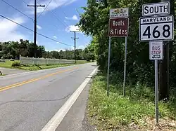 Maryland Route 468 (MD 468) is a state highway in the U.S. state of Maryland. The highway runs 11.19 miles (18.01 km) from Snug Harbor Road in Shady Side north to MD 214 in Edgewater in Anne Arundel County. MD 468 is a J-shaped route that connects Edgewater with the Chesapeake Bay communities of Galesville and Shady Side. The Galesville–Shady Side road was constructed as part of MD 255 in the 1920s. MD 468 was constructed north of MD 255 in the early 1930s. MD 255 was rerouted to enter Galesville and MD 468 was extended along MD 255's old route to Shady Side in the late 1940s.