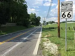 Maryland Route 66 (MD 66) is a state highway in the U.S. state of Maryland. Known for most of its length as Mapleville Road, the state highway runs 12.84 miles (20.66 km) from U.S. Route 40 Alternate (US 40 Alternate) in Boonsboro north to MD 64 near Smithsburg. MD 66 parallels the western flank of South Mountain in eastern Washington County, connecting Boonsboro and Smithsburg with Interstate 70 (I-70) and US 40. MD 66 was constructed in the late 1920s and early 1930s from Boonsboro to Cavetown. The state highway was extended north through Smithsburg after MD 64 bypassed the town in the late 1950s.