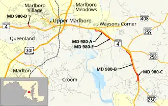 - MD 980D is the designation for the 0.27-mile (0.43 km) segment of Ritchie Marlboro Road from the road's interchange with MD 4 (Pennsylvania Avenue) to the intersection of Ritchie Marlboro Road and Old Marlboro Pike west of Upper Marlboro in Prince George's County.[1][5]