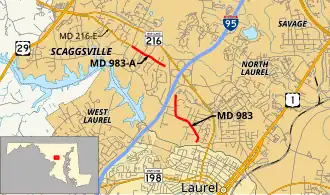 Maryland Route 983 (MD 983) was the unsigned designation for a pair of state highways in the U.S. state of Maryland. The highways formed parts of the old alignment of MD 216 on either side of Interstate 95 (I-95) in North Laurel in southeastern Howard County. MD 983 had a length of 1.02 miles (1.64 km) and ran on the east side of I-95. MD 983A spanned 0.71 miles (1.14 km) on the west side of I-95. MD 216 through North Laurel was built in the early 1920s. The segments of MD 983 were designated when MD 216 was relocated east of I-95 in the early 1960s and west of I-95 in the late 1970s. In 2017, both MD 983 and MD 983A were removed from the state highway system and transferred to county maintenance.