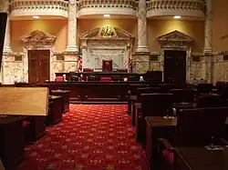 The Senate chamber is located in a wing added to the original structure between 1902 and 1905. The room is illuminated by a Tiffany-style skylight above. Red carpet emblazoned with the state seal covers the entire floor. Large Ionic columns line the walls and support the viewing gallery. The marble along the walls and the columns are flecked with rust and black, Maryland's official colors.