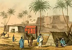 In the early nineteenth century, Murzuk served as the jumping off point for multiple British expeditions in search of Lake Chad and the legendary Timbuktu. The 1822, the Denham, Oudney and Clapperton expedition traveled from Tripoli to Murzuk, where they attempted to obtain protection and supplies for their journey south. The town was considered unhealthy by many British explorers and led to illness for many, killing some and forcing others back to Tripoli. According to James Richardson: "Feb 26th (1846). I must now consider myself recovered from indisposition. At first, people talked so much about Mourzuk fever that I thought I must have it as a matter of course ... Three-fourths of the Europeans who come here invariably have the fever. I speak of the Turks. It attacks them principally in the beginning of the hot, and cold, weather, or in May and November. ... Mourzuk is emphatically called, like many places of Africa, Blad Elhemah, country of fever."[10]
