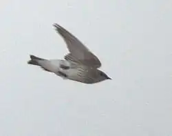 Adult Mascarene martins of the nominate subspecies are 15 cm (5.9 in) long with wings averaging 117 mm (4.6 in)[8] and weigh 23.9 g (0.84 oz).[15] This small hirundine has dark brown-grey upperparts with faint streaking. It has grey-brown underparts becoming white on the throat and lower abdomen, all being heavily streaked with black. The slightly forked tail averages 54.6 mm (2.15 in) long and has white edges to the brown undertail coverts. The wings are blackish-brown and the bill and legs are black. The eyes are dark brown and the black bill averages 11.3 mm (0.44 in) long. The sexes are similar, but juvenile birds have more diffuse breast streaking, and white tips to the feathers covering the closed wing. The Madagascan subspecies is overall paler and larger-billed than the nominate form. It has denser streaking on the breast, but only very fine lines on the lower abdomen and on the white undertail.[8] It is distinctly smaller than the nominate subspecies, 12–14 cm (4.7–5.5 in)[16] in length with an average weight of 20.6 g (0.73 oz).[15] This martin moults in December and January on Mauritius, and Madagascan breeders wintering on the African mainland moult in June and July.[8]