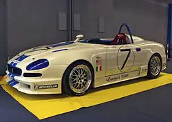 The Maserati 320S is a concept racing car based on the 3200 GT and designed by Italdesign Giugiaro as a barchetta. It was first shown at the 2001 Geneva Motor Show as a glimpse of an open top Maserati model.[13][14] A true barchetta design, the 320S was a single-seater and was fully outfitted for competition with six-point racing belts, an exposed roll bar behind the driver, fire extinguishing system and racing seat supplied by Sparco; weather protection was limited to a small aeroscreen in front of the driver. Compared to the 3200 GT, the 320S's wheelbase was shortened by 22 cm (8.7 in), while the engine remained the same as the 3200 GT with a 6-speed manual transmission.
