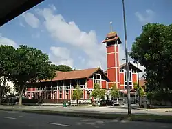 The modern Masjid Kampung Siglap is built in a modern architectural style with elements from traditional Malay architecture mixed in.[6] Malay architectural elements include large timber beams to support the roof as well as timber roof trusses, both of which can be found in a normal "kampung" village.[4] According to the Majlis Ugama Islam Singapura, the mosque can fit 3,000 worshippers.[12] The design of the mosque was determined via a contest where children could draw how they envisioned the mosque to look like.[13]