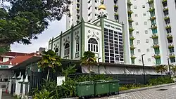The site where the mosque stands on in the present day was originally a small wooden surau, founded in 1873 by Wak Tanjong, a Bugis trader who emigrated to Singapore from Malacca.[1][2] He was buried behind the mosque along with some members of his family in a simple mausoleum building.[1] The wooden mosque was subsequently demolished and replaced with a larger, firm concrete structure in the 1930s by Mohammed Ally Tanjong, an Indian Muslim trader who was also the son of the founder.[1][3][4] Plans were made to expand the mosque in 1990, and reconstruction works would start in April of 1996.[3][5] The mosque was eventually rebuilt into its current form and then reopened by 1998.[6]