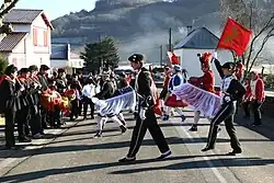 The maskarada [mas̺ˈkaɾada] is an itinerant set of traditional dances, theatre acts and parades that takes place annually in different towns and villages across the Basque region of Soule, France (Zuberoa in Basque), during the time of carnival. It is generally referred to in the plural (maskaradak) as it is repeated across the region on the streets of villages (one day per village) over the span of a month or two in late winter through spring. The plays are performed by the villages' (usually younger) inhabitants, and the arrangements for each maskarada are the responsibility of each participating village. Sometimes, when two villages are very small, they will share arrangements together.
