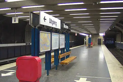 Masmo metro station is a station on the red line of the Stockholm metro, located in Masmo, Vårby, Huddinge Municipality. The station was opened on 1 October 1972 as part of the extension from Vårberg to Fittja.[2] It was the first of the "grottstations" (cave-stations).[3] The distance to Slussen is 16.1 km (10.0 mi).