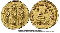 Early gold dinars imitated Byzantine and Sasanian coins of the time, but as time progressed, they began to take on a more uniquely Islamic style. Two early examples, minted in approximately 692 and 694 C.E., have similar designs. Both have a depiction of figures on the obverse while the reverse includes a pyramid-shaped pedestal and a staff with a circular head resting at the top. These two early coin types both bear significant resemblance to Byzantine coins of the same period and were all but copied whole cloth from Byzantine designs, the only alterations being the removal of the horizontal bar of the Byzantine cross for religious reasons and the conversion of figures on the front to wearing Islamic-style dress.[3] In the year 692 C.E., the shahada or profession of faith was added onto the obverse and in 694 C.E. it was added to the reverse.[3] In the year 696-7 C.E., images were almost completely removed from coins and were replaced by coins exclusively decorated with inscriptions.[4]