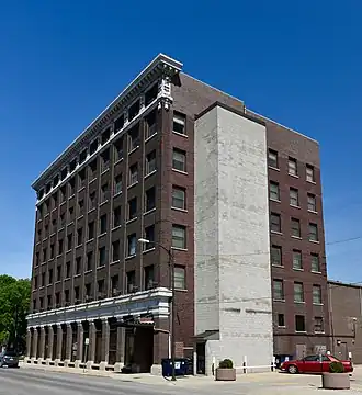 Most of the buildings in the downtown area were builder-contractor designed. Among the builders were Geo. P. Petersen & Son and M.M. Moen Company (later Davey & Moen). There are also several examples of architect designed buildings. They include Parker's Opera House (1883) by William Foster, the former Mason City Public Library (1904) by Patton & Miller, the Park Inn Hotel (1909) and the City National Bank (1910) by Frank Lloyd Wright, First National Bank (1911) by Liebbe, Nourse & Rasmussen, the MBA Building (1917) by Bell & Bentley, the Hanford Hotel (1921) by Proudfoot, Bird & Rawson, the YMCA (1926) by Tyrie and Chapman, and the former First Church of Christ, Scientist (1928) by Clyde W. Smith. There are also buildings designed by prominent local architects E.R. Bogardus and Karl Waggoner.[2] An apartment building, The Kirk (1903), destroyed by fire in 2023,[3] is also individually listed on the National Register.