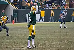 On July 27, 2011, the Packers re-signed Crosby to a 5-year, $14 million deal.[41] In Week 4, Crosby kicked a season-high seven PATs against the Denver Broncos.[42] In Week 5, he equaled his then record distance on a 56-yard field goal on October 9, 2011, in the third quarter against the Atlanta Falcons.[43] In Week 7, Crosby set the franchise record when he made a 58-yard field goal in the third quarter as part of a four-field-goal game.[44] Crosby earned NFC Special Teams Player of the Week honors for Weeks 5 and 7.[45][46] For the month of October, Crosby won NFC Special Teams Player of the Month.[47] Crosby kicked four field goals in a game on three occasions, which were Week 5 (Falcons), Week 7 (Minnesota Vikings), and Week 14 (Oakland Raiders).[48][49][50] He finished the 2011 season converting 68-of-69 extra point attempts and 24-of 28 field goal attempts.[51] He led the league in extra points attempted and converted.[52] The Packers' season ended in the Divisional Round against the New York Giants. In the 37–20 loss, he converted both extra point attempts and both field goal attempts.[53][54]