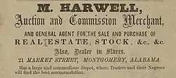 ![]() "M. Harwell, Auction and Commission Merchant, Also Dealer in Slaves," 1859 Montgomery city directory | |