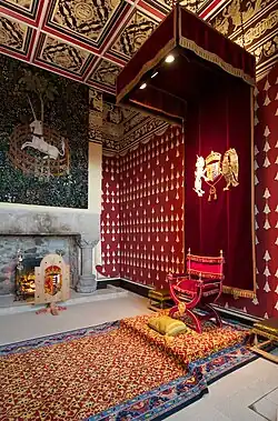 The buildings that formed the backdrop for the events of the baptism are still intact with few external changes since 1594. The interiors of the Great Hall, Chapel Royal, and Palace have been returned to their original layout and proportions, and subdivisions made during the later use of the castle as army barracks removed. The rooms in the palace were restored in 2010.[146] Painted decoration surviving in the Chapel Royal by Valentine Jenkin mostly dates from 1629 and shadow traces of paintwork from 1594 can be seen on the exterior around the windows.[147] The Prince's Tower, adjacent to the Palace, was also refurbished with new floors at this time.[148][149] No furnishings from 1594 are known to survive, except a plain oak pulpit possibly used by Patrick Galloway and David Cunningham, which is stored by Historic Environment Scotland.[150]