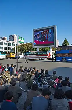 All North Korean journalists are members of the Workers' Party.[8] Candidates for journalism school must not only prove themselves ideologically clean but also come from politically reliable families.[9] Journalists who do not follow the strict laws face punishment in the form of hard labour or imprisonment, or sometimes even execution.[8][10] Only news that favours the regime is permitted, whilst news that covers the economic and political problems in the country, or criticisms of the regime from abroad is not allowed.[11] Domestic media and the population itself are not allowed to carry or read stories by foreign media and can be punished for doing so.[8][12]