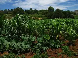 The Massachusett occupied fertile flatlands. Men and women cleared fields first by burning trees, then by removing stumps. Women grew food crops, but men were involved in tobacco cultivation.[14] Women used clamshell hoes.[15] Women cultivated crops such as northern flint corn, called weachimineash in Massachusett, a variety of brands, squashes, and pumpkins.[16] They planted corn in mounds, then planted beans that grew up the cornstalks, and finally the cucurbits, which protected roots and discouraged weeds.[14] This companion planting method is called the Three Sisters.[17]