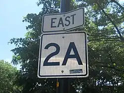 Route 2A is a 98.5-mile-long (158.5 km) east–west state highway in Massachusetts. It exists in several sections, mainly as parts of former Route 2 that have been moved or upgraded. Route 2A runs from Greenfield in the west to Boston in the east. It formerly extended to Shelburne Falls in Buckland in the west, but as of 2007, the route terminates at Interstate 91 (I-91) in Greenfield.