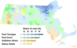 On Election Day, Tsongas won by a margin of 37,955 votes out of over 835,000 cast. Unlike most Democratic primaries in the state, Tsongas was able to win without a strong showing in Boston and its surrounding suburbs, where most Democrats lived. Instead, he relied on strong support from his base of constituents around Lowell. While Guzzi was strong throughout the state, he was overwhelmed by Tsongas's support in Lowell and the Merrimack Valley. Alioto performed strongest on the South Coast.