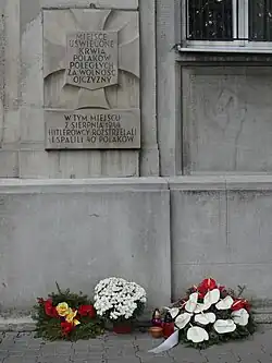 In the 1950s victims of the massacre were commemorated with two commemorative plaques. One of them, designed by sculptor Karol Tchorek, is displayed on the wall of monastery (facing Andrzej Bobola Street). Second is a free-standing one located near the church's fence on Rakowiecka Street.[16]