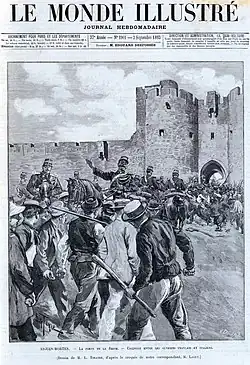 Despite the intervention of a justice of the peace and gendarmes, the situation rapidly deteriorated.[5] Some trimards reached Aigues-Mortes and said that the Italians had killed some local Aiguemortais, causing their ranks to grow from the local population and workers who had been unable to secure employment.[5] A group of Italians was then attacked and had to take refuge in a bakery that the rioters wanted to set fire to. The prefect called in troops at around 4 o'clock in the morning; they did not arrive on the scene until 6 pm, after the drama.[6]