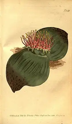 Massonia depressa, the hedgehog lily, is a species of flowering plant in the family Asparagaceae. It is a bulbous geophyte native to the Cape Provinces and Free State of South Africa.[3] Growing to 10 cm (3.9 in) tall by 50 cm (20 in) broad, it is a bulbous perennial with two opposite leaves lying flat on the ground. A spiky cluster of white, yellow or brown flowers appears at the centre of the plant in winter. The flowers are uniquely scented like yeast, to attract pollination by gerbils and other rodents. The anther is exceptionally long - up to 2mm. The seed capsules are inflated, enabling them to be wind-borne.
