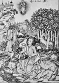The Temptation of Christ is his most famous and common print, existing in about 20 impressions.[4][5] It draws inspiration from the compositions of Michael Pacher and Master E. S., but marks a step forward from these models by integrating the monumental confrontation between good and evil into a fully realized landscape setting apparently observed from nature.[4][14] In particular, the design of Satan recalls the demons from Schongauer's The Torment of St. Anthony while providing a notable precedent for Albrecht Dürer's depiction of the devil in Knight, Death, and the Devil.[4]
