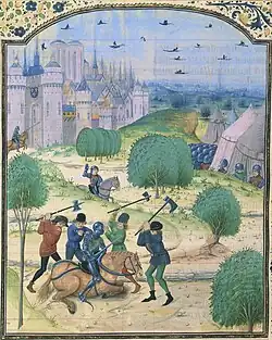 His production is so abundant and varied that historians tend to attribute part of it to his assistants, and have managed to distinguish certain artists such as the Master of Fitzwilliam 268, with a more tense and agitated style, the Master of the Genealogia Deorum of Bruges, with a looser style, the Master of the Jardin de vertueuse consolation or the Master of the Life of Saint Colette of Ghent.[1][2] His style has also been compared to that of the Master of the Moral Treatises, whom he influenced.[3]