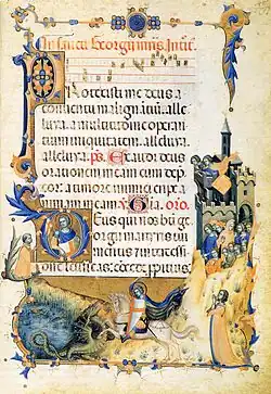 Fragments of another volume of the same missal are in the Pierpont Morgan Library in New York (M.713). The painter was an exponent of the Roman School of Illumination and probably worked both in Rome and in Avignon. The work was commissioned by Cardinal Jacopo Stefaneschi, who resided in Avignon, home of the papal court from 1309. The exceedingly magnificent missal was created around 1320 and was intended for the Basilica of St. Peter in Rome.[1] In addition to the decoration of other manuscripts, panel paintings are also attributed to the artist, but this is disputed.[2]