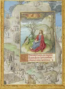 Master of the Lübeck Bible (fl. c. 1485 – c. 1520) was a Flemish manuscript illuminator and printmaker. He is named for a series of woodcuts designed for a Bible printed at Lübeck, Germany in 1494.[1] He has long been known as a contributor to several early printed books; only recently, however, has their style been associated to certain illuminated manuscripts. Relatively few illuminations have been ascribed to the Master. Those that have been share an almost frenetic sense of movement, combined with a distorted quality, that distinguishes his printed output. His figures have oddly elongated faces, while the spaces they inhabit have conversely been strangely foreshortened. The Master's city of origin is unknown; his close association with the Master of James IV of Scotland, who is thought to have been active in Ghent, may indicate that his base of operations was that city.