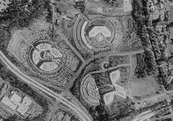 The facility is a three-story building that incorporates travertine stone and architectural concrete to maximize the effectiveness of natural resources.[12][20] The facility is composed of a central lobby with a full-height atrium and two quarter-circle wings to the north and west with smaller atria, all incorporating natural features such as ficus trees and an indoor stream.[12][20] Also on-site is a cafeteria, a company store, and other employee amenities.[20] A 1,100 car parking facility is built into a hillside on the site.